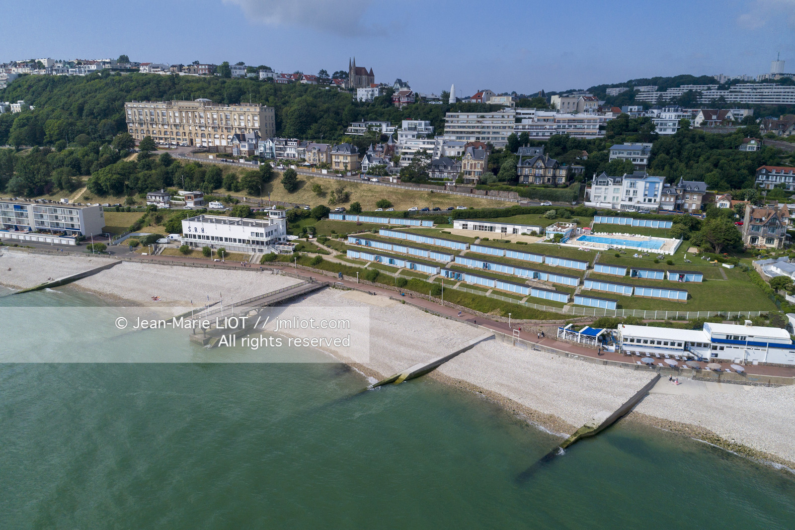 .Aerial view of the beach of Sainte-Adresse with its beach cabins and the swimming pool regattas of the harbor. Photo © Jean-Marie Liot